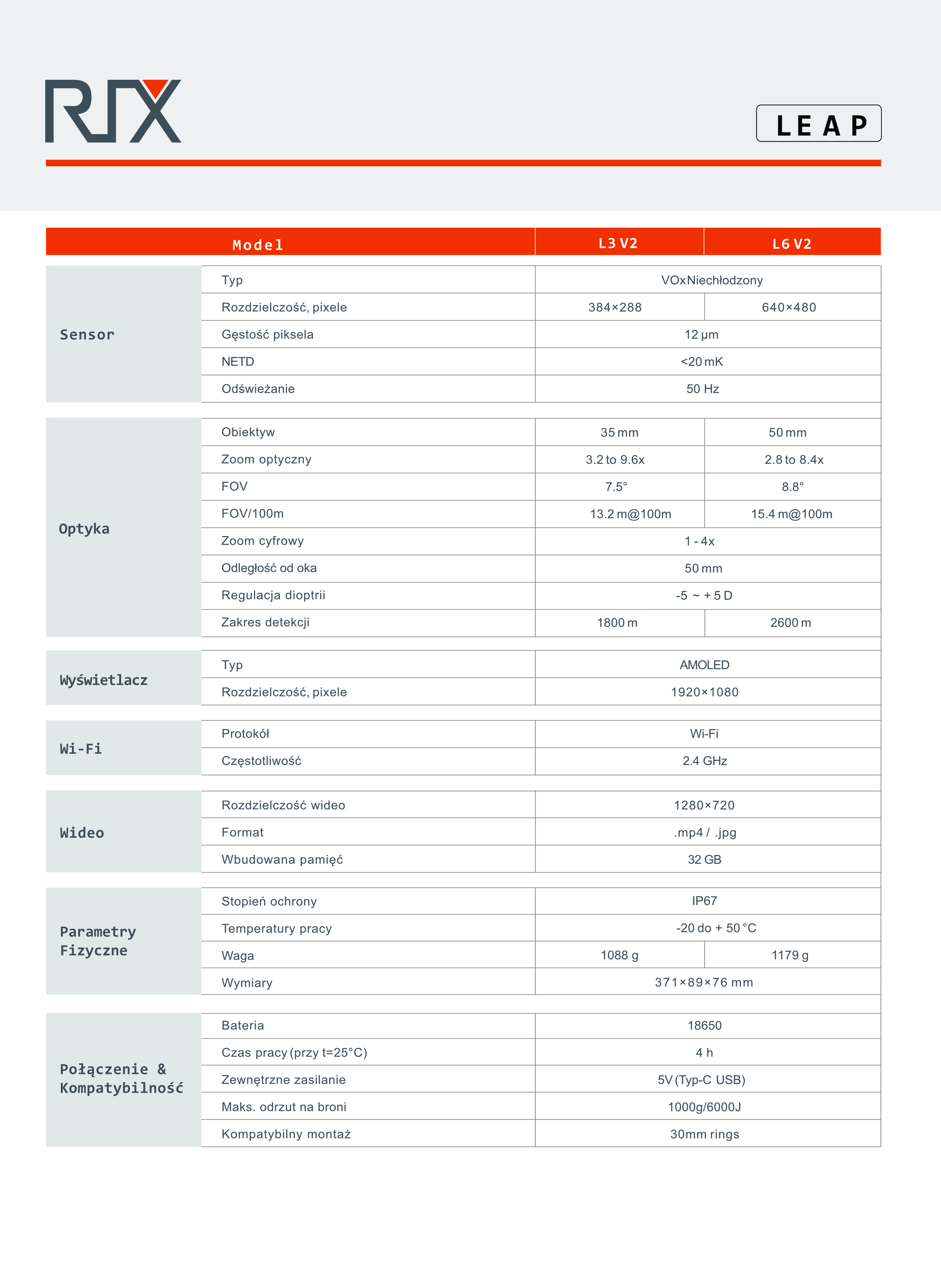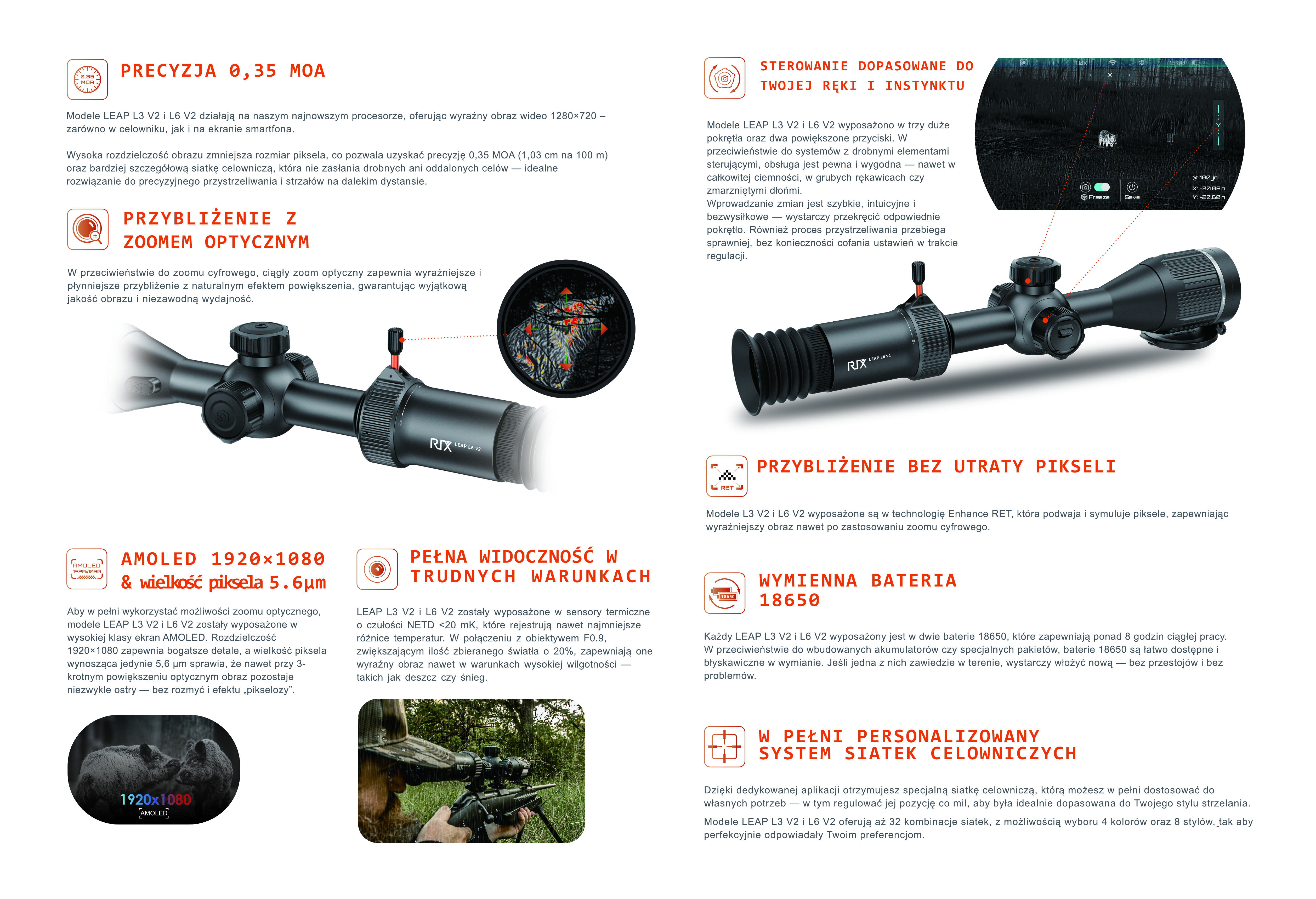 PRECYZJA 0,35 MOAModele LEAP L3 V2 i L6 V2 działają na naszym najnowszym procesorze, oferując wyraźny obraz wideo 1280×720 – zarówno w celowniku, jak i na ekranie smartfona.Wysoka rozdzielczość obrazu zmniejsza rozmiar piksela, co pozwala uzyskać precyzję 0,35 MOA (1,03 cm na 100 m) oraz bardziej szczegółową siatkę celownika, która nie zasłania drobnych ani oddalonych celów – idealne rozwiązanie do precyzyjnych przestrzeliwań i strzałów na dalekim dystansie.STEROWANIE DOPASOWANE DO TWOJEJ RĘKI I INSTYNKTUModele LEAP L3 V2 i L6 V2 wyposażono w trzy duże pokrętła oraz dwa powiększone przyciski. W przeciwieństwie do systemów z drobnymi elementami sterującymi, obsługa jest pewna i wygodna – nawet w całkowitej ciemności, w grubych rękawicach czy zmrożonym dłoniom.Wprowadzanie zmian jest szybkie, intuicyjne i bezwysiłkowe – wystarczy przekręcić odpowiednie pokrętło. Również proces przystrzeliwania przebiega sprawniej, bez konieczności cofania ustawień w trakcie regulacji.PRZYBLIŻENIE Z ZOOMEM OPTYCZNYMW przeciwieństwie do zoomu cyfrowego, ciągły zoom optyczny zapewnia wyraźniejsze i płynniejsze przybliżenie z naturalnym efektem powiększenia, gwarantującą wyjątkową jakość obrazu i niezawodną wydajność.PRZYBLIŻENIE BEZ UTRATY PIKSELIModele L3 V2 i L6 V2 wyposażono są w technologię Enhance RET, która podwaja i symuluje piksele, zapewniając wyraźniejszy obraz nawet po zastosowaniu zoomu cyfrowego.AMOLED 1920×1080 & WIELKOŚĆ PIKSELA 5.6μmAby w pełni wykorzystać możliwości zoomu optycznego, modele LEAP L3 V2 i L6 V2 zostały wyposażone w wysokiej klasy ekran AMOLED. Rozdzielczość 1920×1080 zapewnia bogatsze detale, a wielkość piksela wynosząca jedynie 5,6 μm sprawia, że nawet przy 3-krotnym powiększeniu optycznym obraz pozostaje niezwykle ostry – bez rozciągnięć i efektu „pikseli”.PEŁNA WIDOCZNOŚĆ W TRUDNYCH WARUNKACHLEAP L3 V2 i L6 V2 zostały wyposażone w sensory termiczne o czułości NETD <20 mK, które rejestrują nawet najmniejsze różnice temperatur. W połączeniu z obiektywem F0.9, zwiększającym ilość zbieranego światła o 20%, zapewniają one wyraźny obraz nawet w warunkach wysokiej wilgotności – takich jak deszcz czy śnieg.WYMIENNA BATERIA 18650Każdy LEAP L3 V2 i L6 V2 wyposażony jest w dwie baterie 18650, które zapewniają ponad 8 godzin ciągłej pracy. W przeciwieństwie do wbudowanych akumulatorów czy specjalnych pakietów, baterie 18650 są łatwo dostępne i błyskawicznie wymienne. Jeśli jedna z nich zawiedzie w terenie, wystarczy włożyć nową – bez przestojów i bez ryzyka utraty możliwości obserwacji.W PEŁNI PERSONALIZOWANY SYSTEM SIATEK CELOWNICZYCHDzięki dedykowanej aplikacji otrzymujesz specjalną siatkę celowniczą, którą możesz w pełni dostosować do własnych potrzeb – w tym regulować pozycję czy jej styl, aby była idealnie dopasowana do Twojego stylu strzelania.Modele LEAP L3 V2 i L6 V2 oferują aż 32 kombinacje siatek, z możliwością wyboru 4 kolorów oraz 8 stylów, tak aby perfekcyjnie odpowiadały Twoim preferencjom.